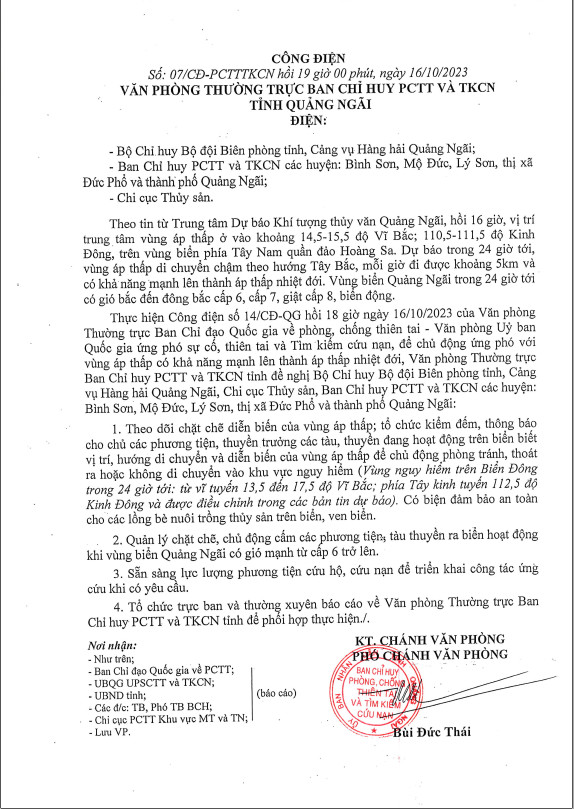 Công điện số 03/CĐ-UBND hồi 20 giờ ngày 17/9/2024 của Chủ tịch UBND tỉnh Quảng Ngãi về việc chủ động ứng phó với áp thấp nhiệt đới có khả năng mạnh lên thành bão