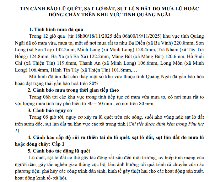 TIN CẢNH BÁO LŨ QUÉT, SẠT LỞ ĐẤT, SỤT LÚN ĐẤT DO MƯA LŨ HOẶC DÒNG CHẢY TRÊN KHU VỰC TỈNH QUẢNG NGÃI